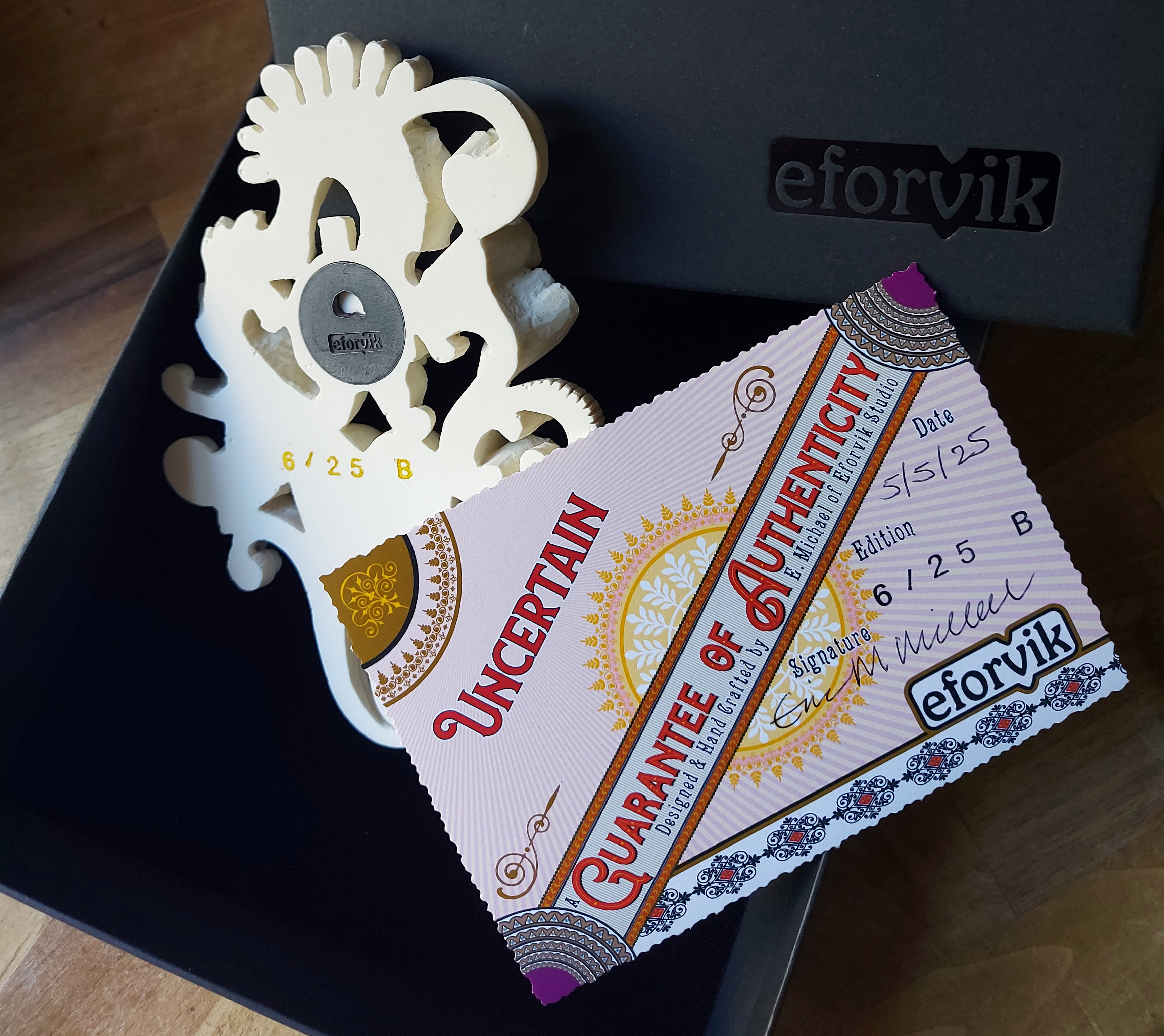 Each design is produced in a limited edition of 25 with every piece receiving the same meticulous attention to detail and finish. Eric Michael personally designs, creates and finishes each piece exclusively for Eforvik. All pieces bear Eric's unique 'makers mark' and is accompanied by an individual guarantee of authenticity.